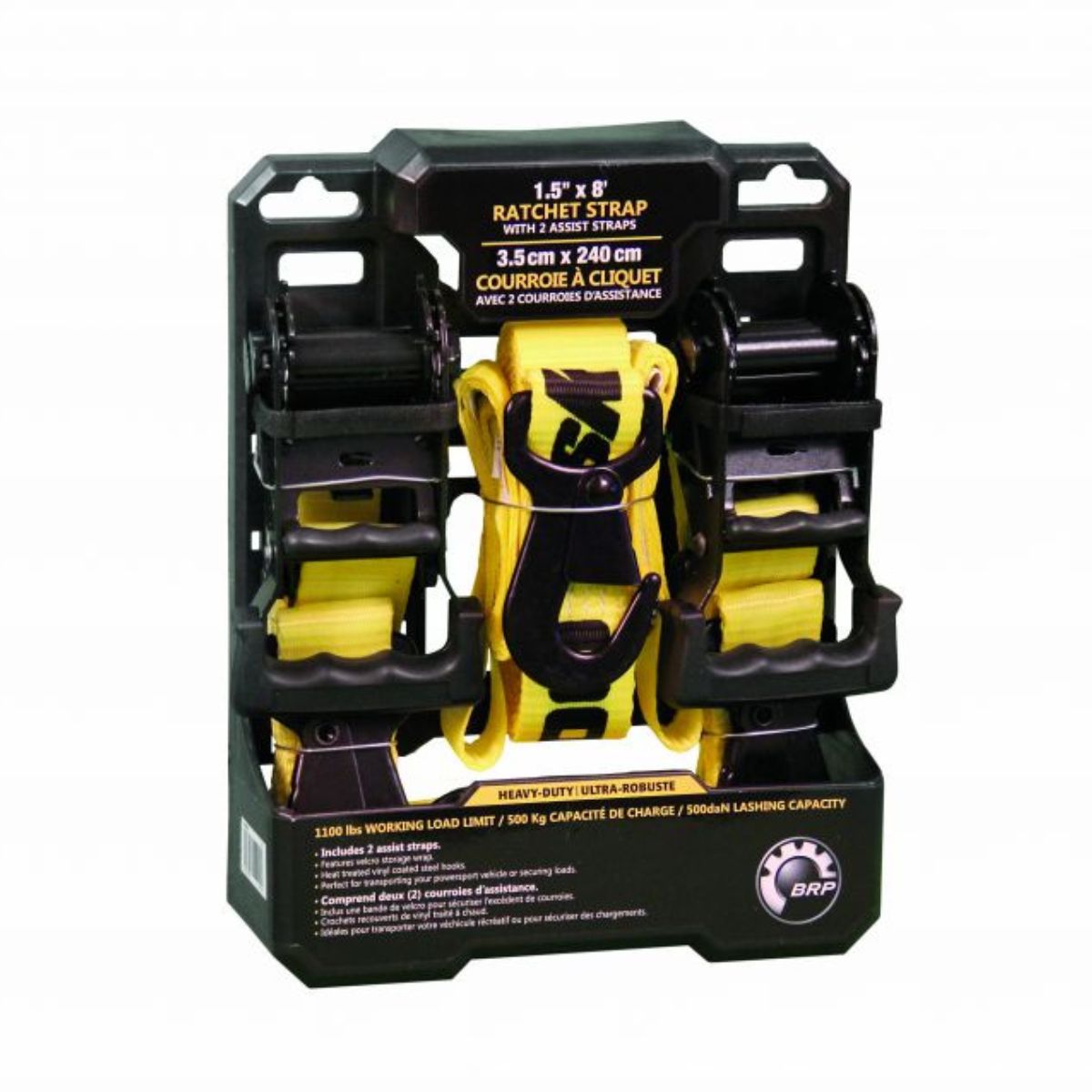 Kahden kappaleen pakkaus kestäviä BRP Heavy Duty räikkäliinoja pinnotetuilla koukuilla. Liinassa Sea-Doo, Ski-Doo ja Can-Am logot.