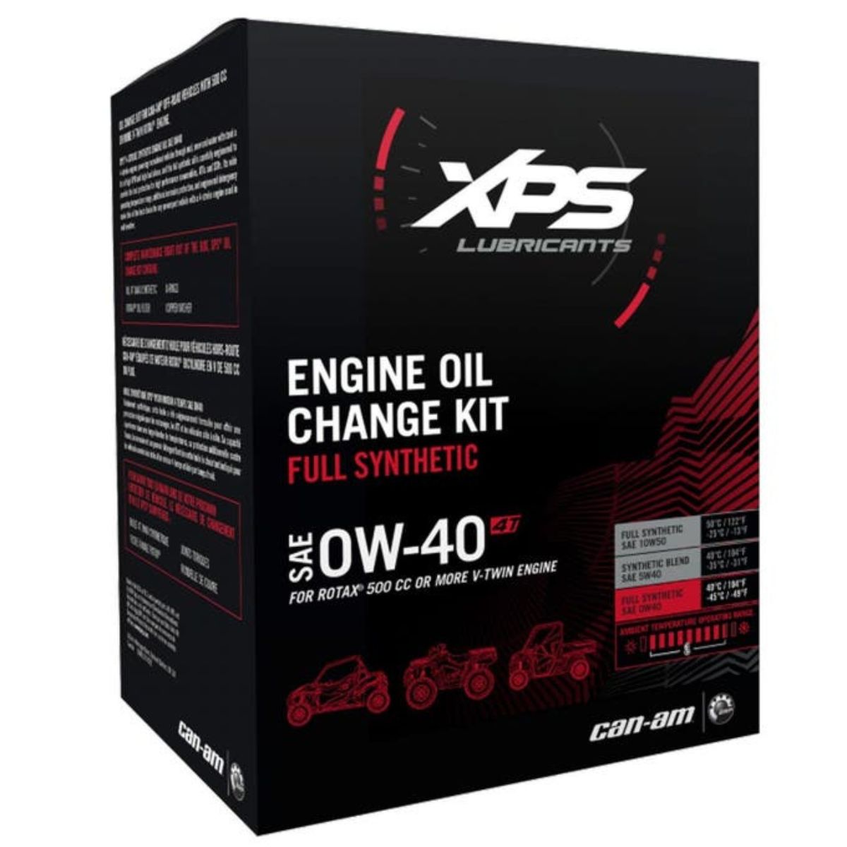 4T 0W-40 Synteettinen öljynvaihtosarja Rotax 500 - ja isommille V-TWIN moottoreille. Tämä sarja tarjoaa kaiken tarvittavan mönkijän öljynvaihtoon. Helppokäyttöinen, kaikki yhdessä -sarja sisältää XPS-synteettisen öljyn, öljynsuodattimen, o-renkaat ja tiivisteen. XPS-öljyt on testattu ja suunniteltu parantamaan moottorikelkkasi suorituskykyä, kestämään pidempään ja suojaamaan moottoriasi paremmin kuin muut öljyt.