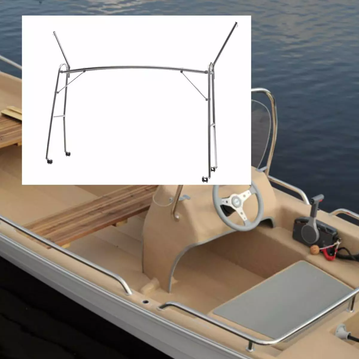 Asennuspaikka: Veneen takaosa tai muu tarkoitukseen sopiva asennuspaikka. Kiinnitetään kätevästi veneessä olemassa oleviin kaiteisiin. Mikäli veneessä ei ole vielä kaiteita, voit tilata ne myös meiltä.